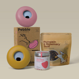 Experience both uses of Pebble - one for freezing, and one for playing. Always have your dog's frozen treat food ready in the freezer, with a spare for enrichment games!