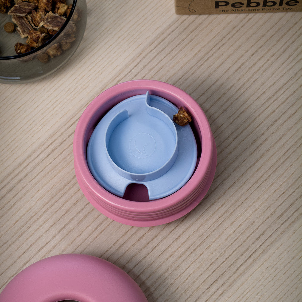 To use Pebble as a puzzle toy, simply insert the included Blocker attachment. Treats will need to travel through two different chambers and navigate dead ends and narrow passages to be released, meaning that your dog needs to paw, nose, and roll Pebble around to get their food!