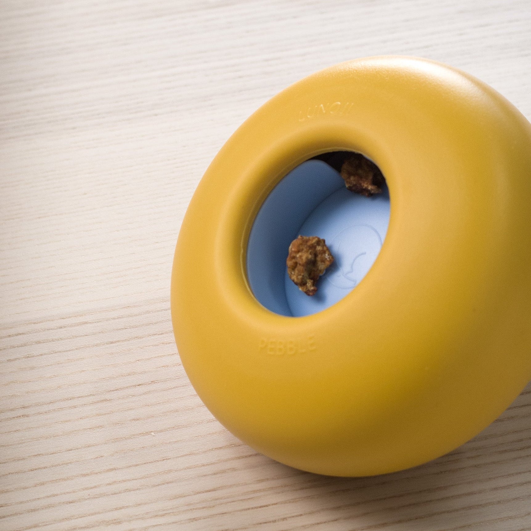 Pebble is a slow feeder toy that works by incorporating a cleverly designed pattern to slow down your dog's pace when licking the food, and a detachable blocker that turns it into an interactive treat dispenser that encourages your dogs to figure out a way to get the treat out of the Pebble.