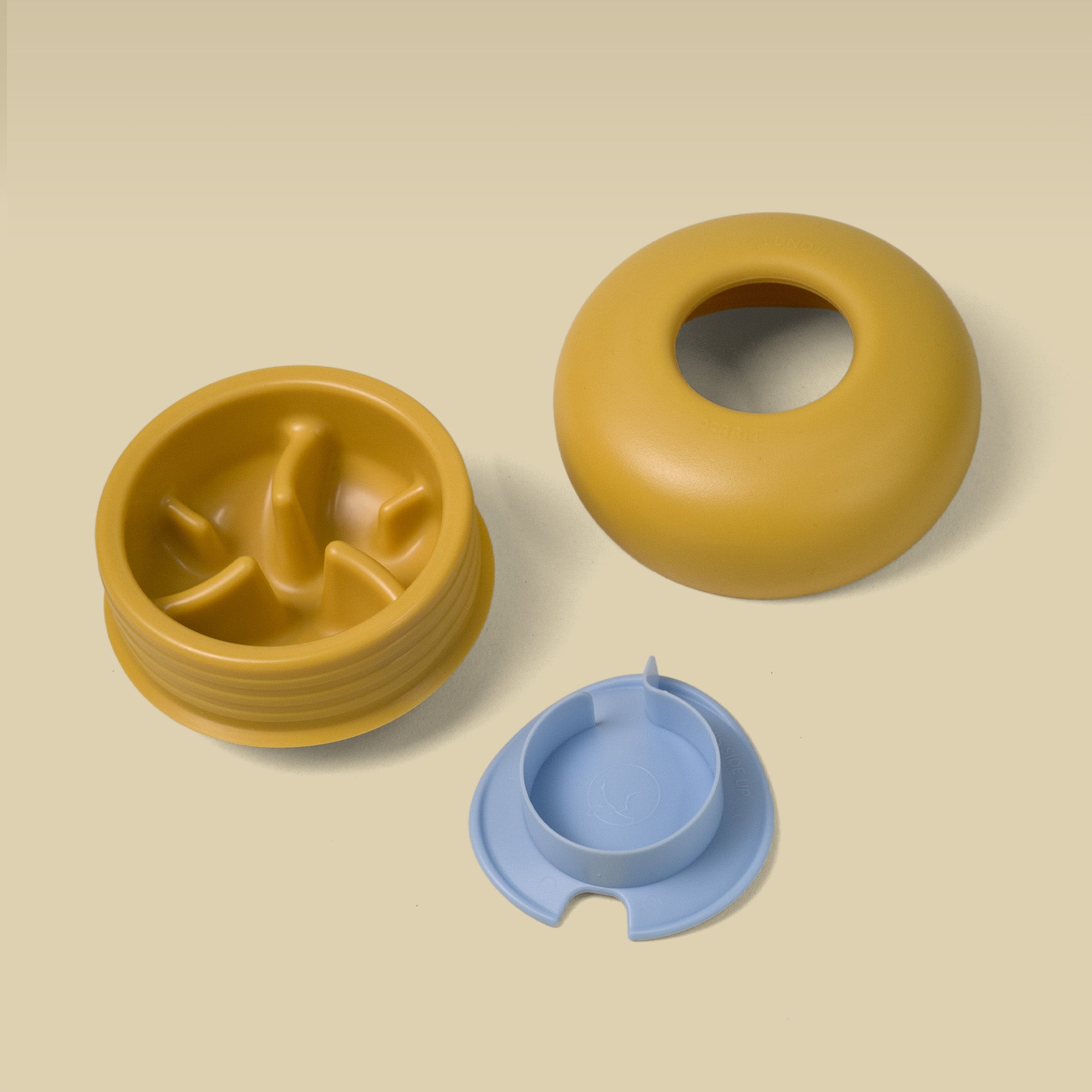 A slow feeder is a specially designed toy, or dispenser that slows down your dog's eating pace through cleverly designed obstacles or puzzles.