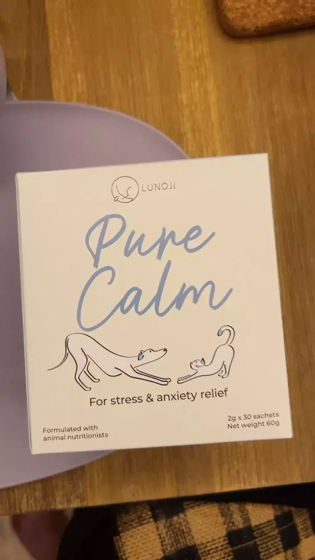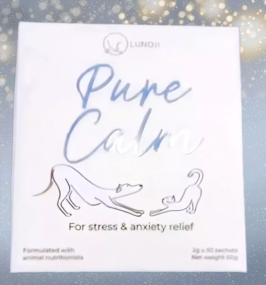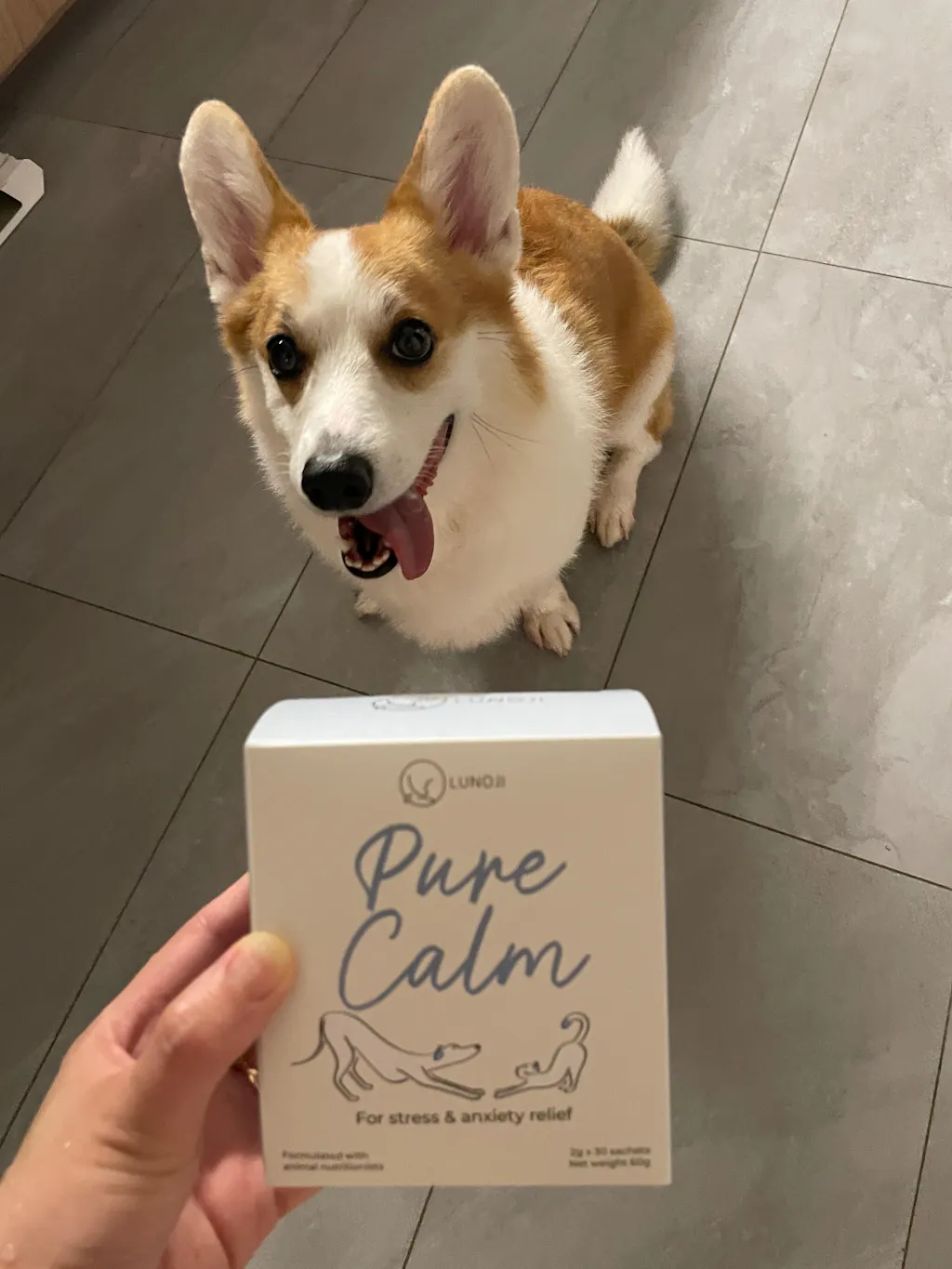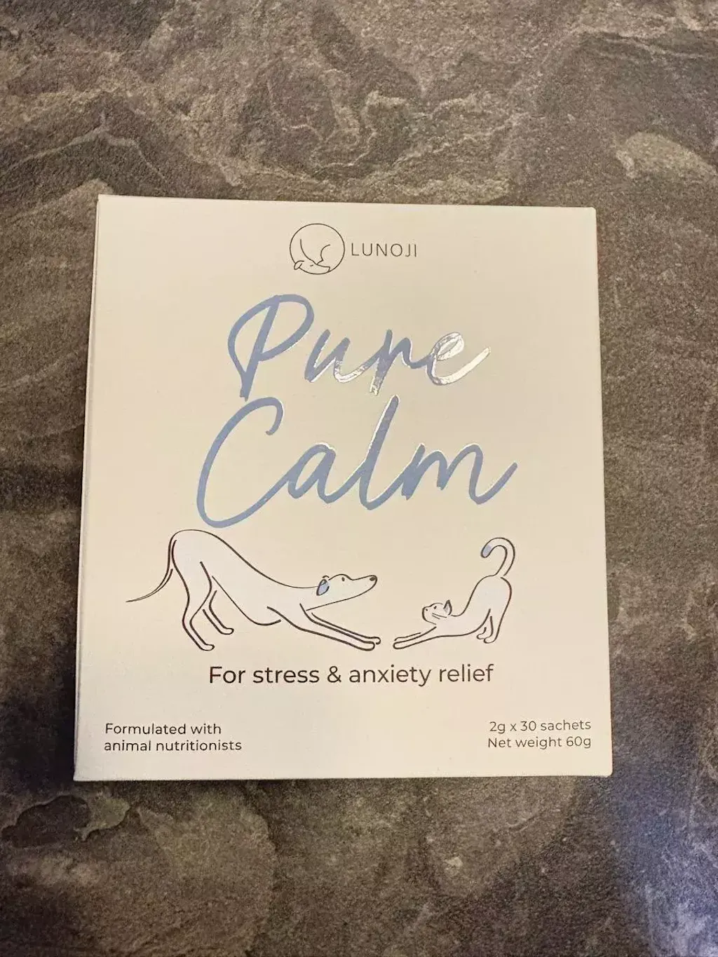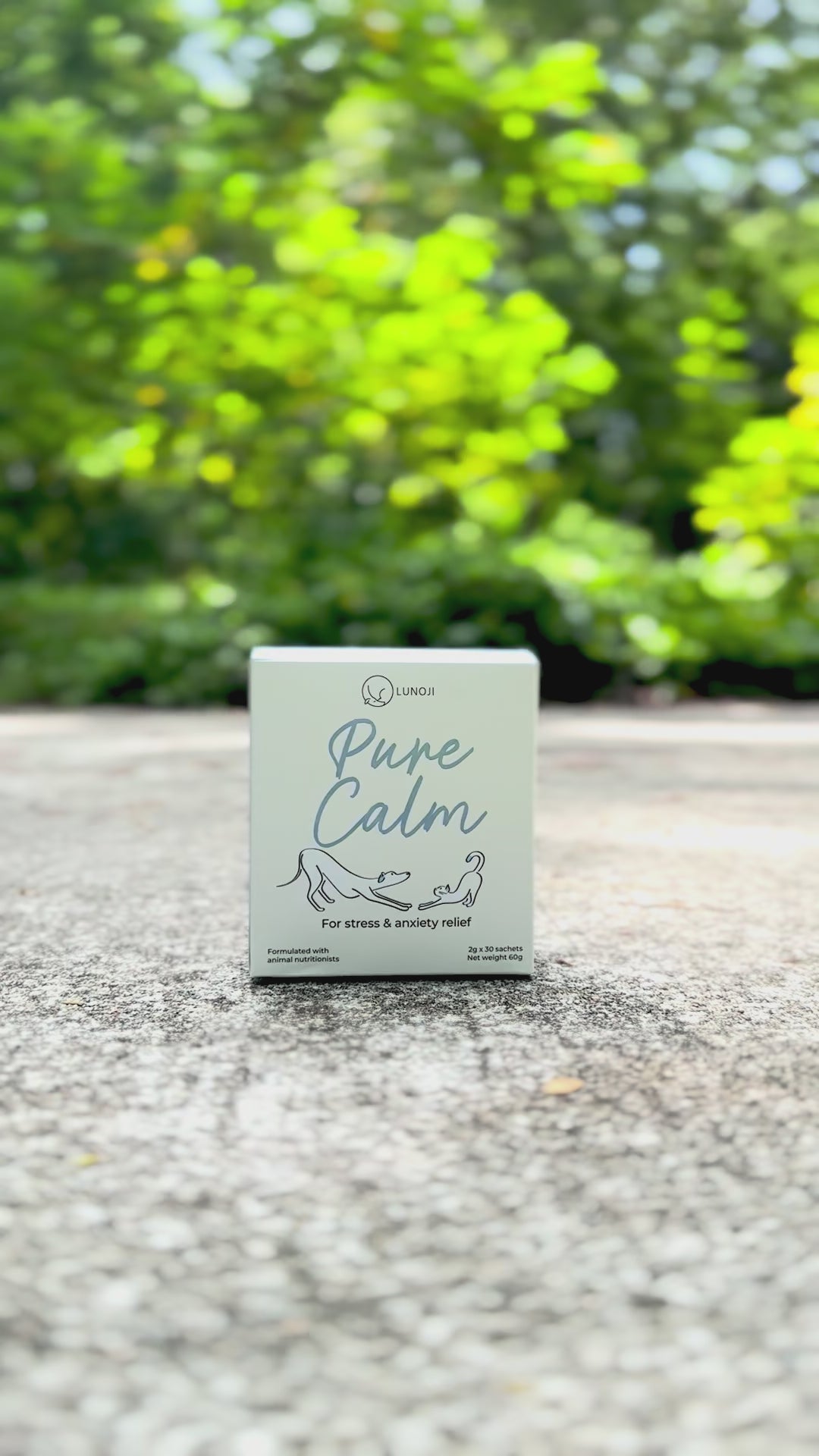 Lunoji Pure Calm is a calming supplement designed for dogs and cats. It helps manage your pet's stress and anxiety without sedation or altering their personality.